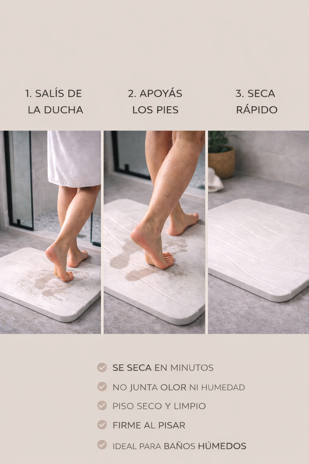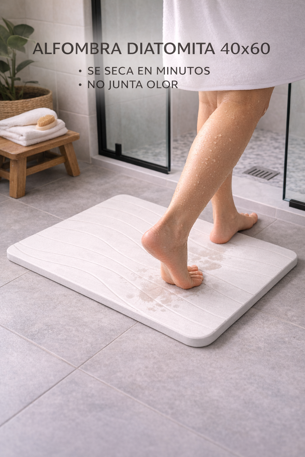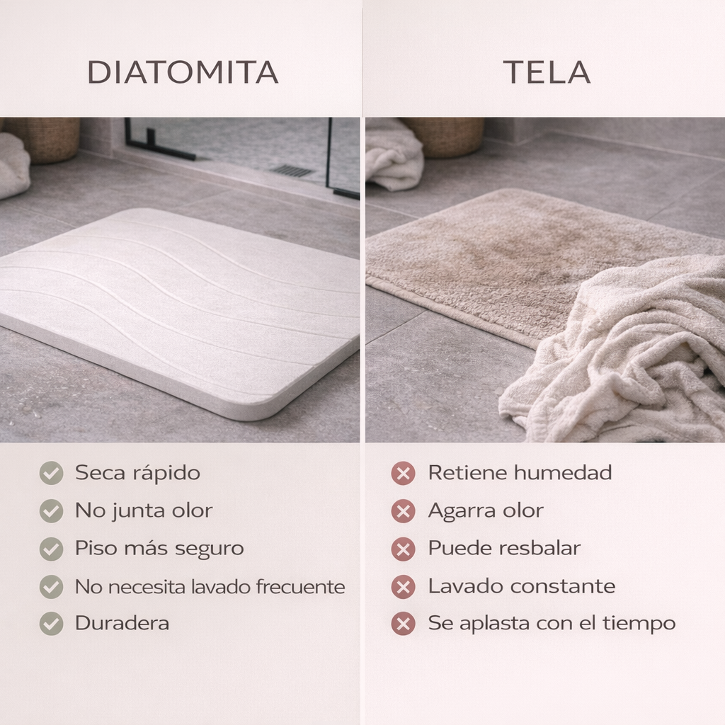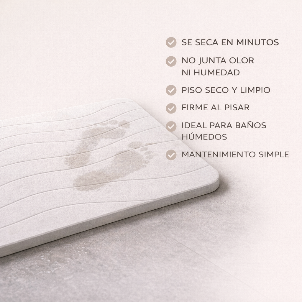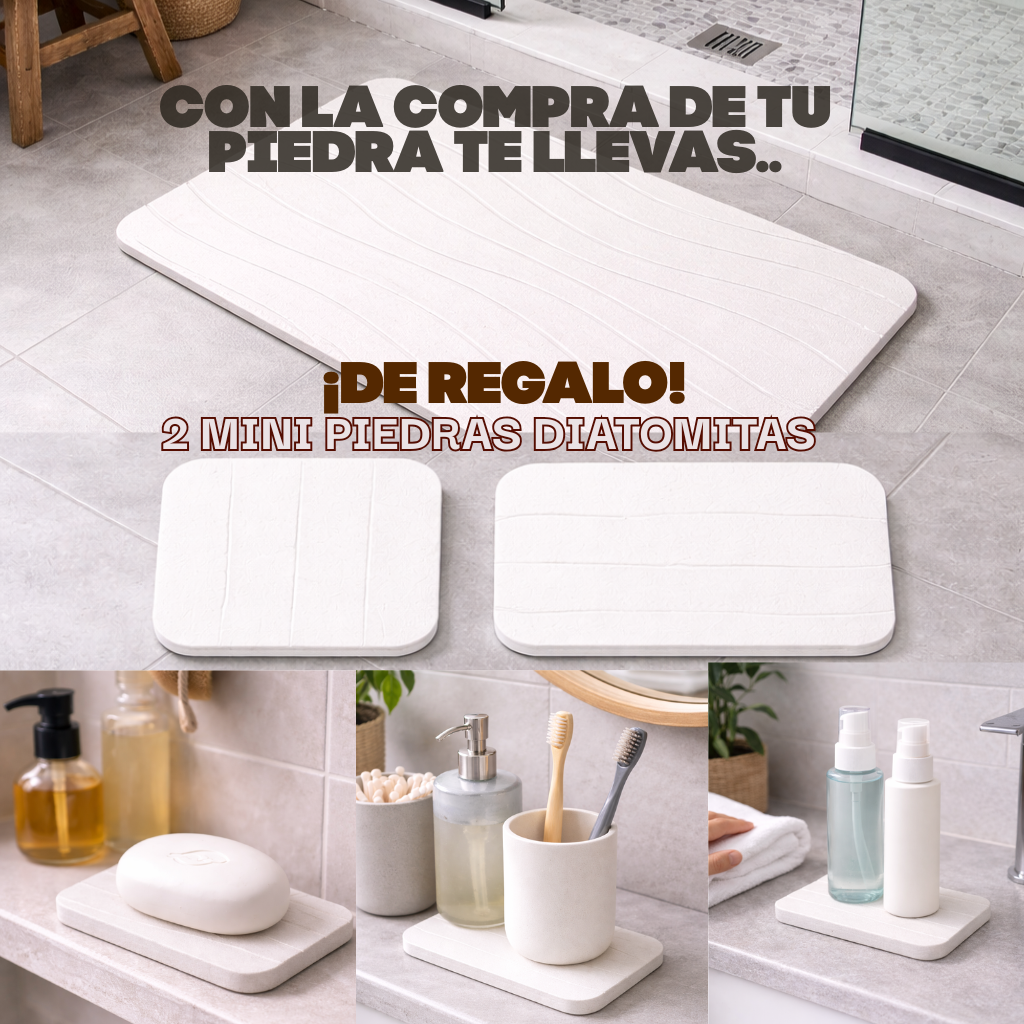 QUIERO MI BAÑO SECOLa piedra diatomita absorbe la humedad al instante. No acumula agua, no genera olor y mantiene tu baño seco.